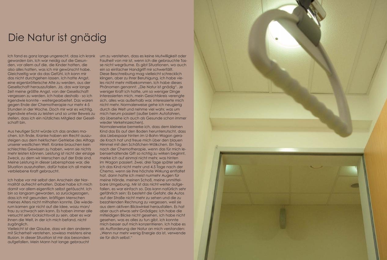 Irene Kernthaler-Moser, Kommunikationsexpertin und Vizepräsidentin des Katholischen Familienverbands, ist 2006 mit der Diagnose Brustkrebs konfrontiert worden. Ihre Behandlung und Genesung hat sie in einem aufwändig gestalteten Fotoband dargestellt und mit einfühlsamen Texten beschrieben. Den Alltag der Frauen in einer Tagesklinik bei der Chemotherapie hat die 47-jährige Wienerin festgehalten: Herzlich willkommen im Klub der Brustkrebs-Betroffenen… „Feiner Klub“, werden Sie sich denken, das hätten Sie nicht unbedingt gebraucht. Niemand tritt dieser Einrichtung freiwillig bei, aber Sie werden merken, dass ein gewisser Humor unter den Betroffenen zur Lebensqualität beiträgt. Mir ist das am stärksten aufgefallen in der Tagesklinik bei der Chemotherapie. Da saßen fünf bis acht Frauen und haben über alle Sprach- und Gesellschaftsbarrieren hinweg versucht das Beste aus der Situation zu machen. Wir haben uns gegenseitig berichtet, wie wir welche Nebenwirkungen bekämpfen, uns über nachwachsende Haare gefreut, Geschichten aus den Familien erzählt und gemeinsam ein Stück Alltag fröhlich gelebt, während die Chemotherapie in unsere Adern hineingeflossen ist. Mir hat das sehr gut getan. Diese Alltagssicht beschreibe ich in diesem Buch völlig subjektiv ohne jeden Anspruch auf Vollständigkeit.